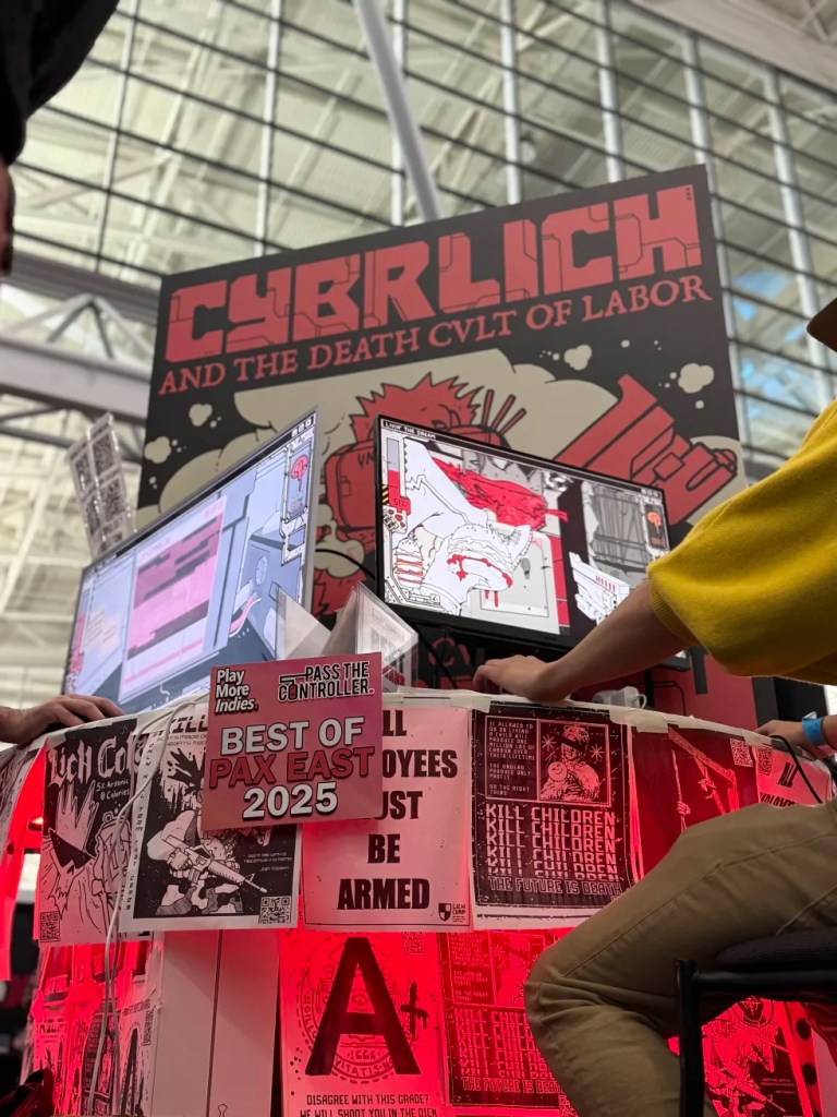 CYBRLICH and the Death Cult of Labor was impossible to miss on the show floor– or at least is was for me. On my first loop around PAX East 2025 my gaze was immediately taken by the monochrome hand-drawn badassery on full display on the corner of PAX Rising. Inspired by games like Doom, CYBRLICH‘s fast-paced kicking, shooting, and sword swinging are governed by a unique consumable mechanic where you switch between chomping on burgers for physical health and puffing on blunts for mental health. Both of which allow you to survive longer and shoot more in either the horde mode or single player campaign. Within the story chunk we played, we were blasting our way sword first through waves of skeletons deep inside a corporation as we prepared to push back against capitalism. The current state of the world made the decimation of the workplace even more satisfying for sure, but with fluid and frantic gameplay and style CYBRLICH showed it had the sauce regardless of the real world weight all around us.